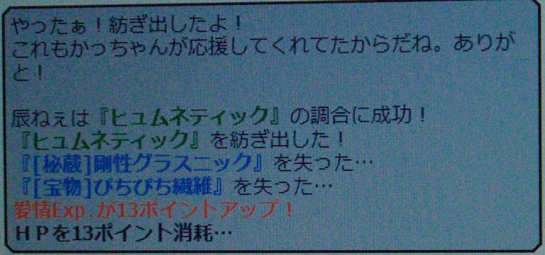今回は「踊り子さんコチラ」と「道に落ちていた物体」を調合、難易度は88とかなりむずかしいです