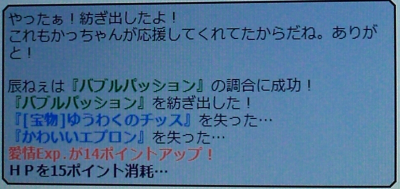 調合してできたのが「[宝物]ゆうわくのチッス」でした
