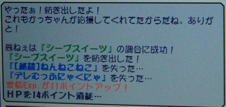 今回の難易度は48と問題なしで、「[宝物]オボンヌみぃつけた」と「かわいいエプロン」を調合しますた♪