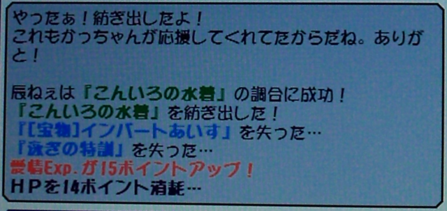 今回の難易度は14とイージー、調合したのは「下駄箱に手紙」と「[宝物]ドッコイクラウン」でしたん♪